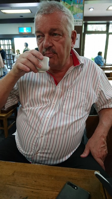 酒蔵ツアーは、一通りの見学・説明を終えると、試飲タイムです。数種類のお酒を試飲することができます。ツアーと試飲が終わり一休みしていると、ガブリエル氏の姿が見えない。あれれ、と思っていたら、はやくも茶店に。試飲会は続くのでした。