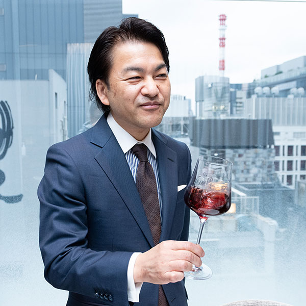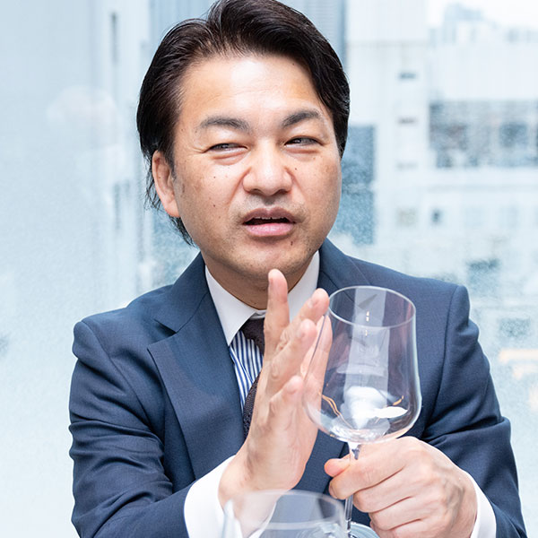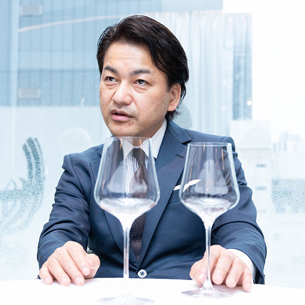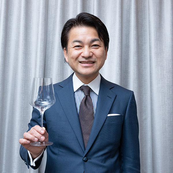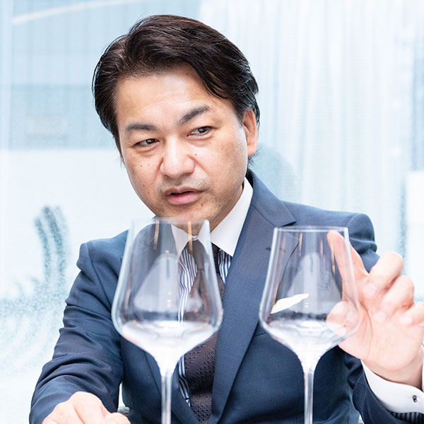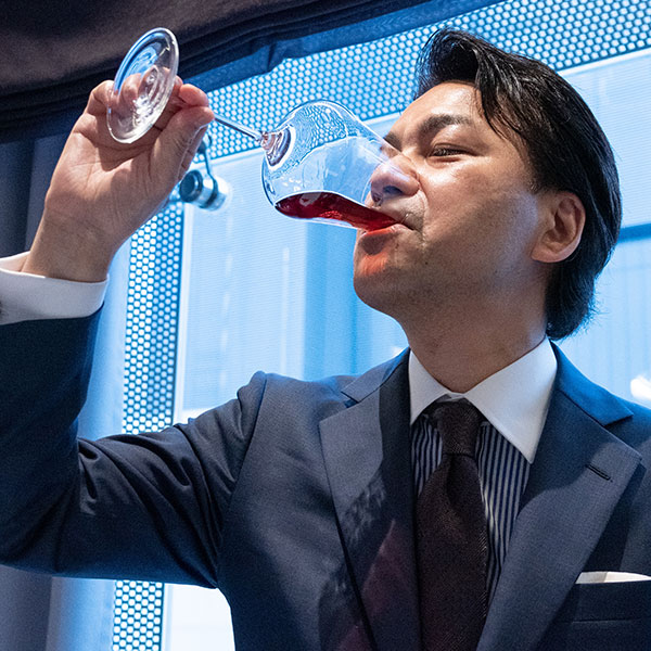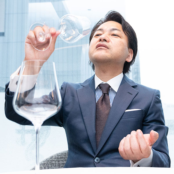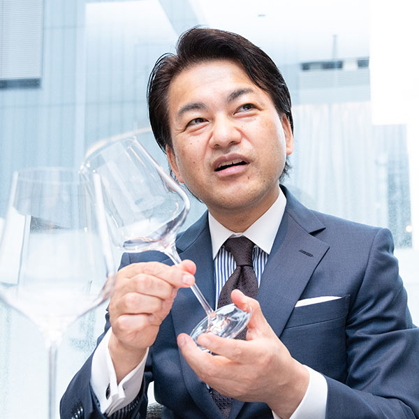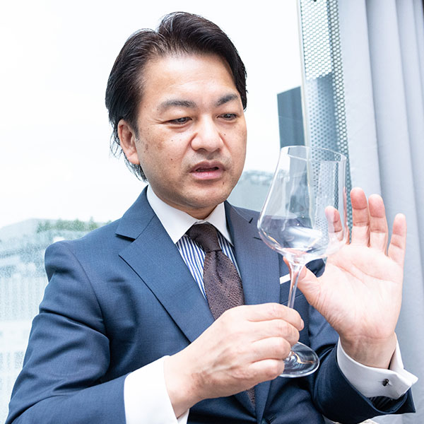 エレガントですね。そして計算し尽くされている。高さ、ボウルの形状、ほら少し反っているでしょう。これがポイントなんです。ワインを注ぐのはボウルの最大ふくらみまで。これで一気に香りが広がる。ふくらみからリムの部分までの空間に香りが満ち溢れ、それが鼻から脳へと昇っていく。香りの喜びを味わい尽くすことができるグラスです。香りだけでなく旨味も存分に楽しめます。