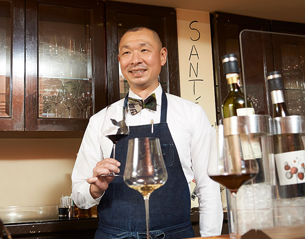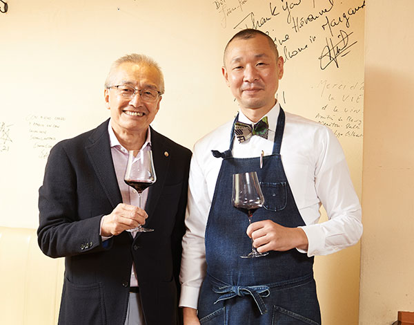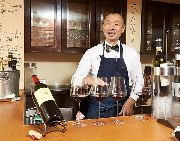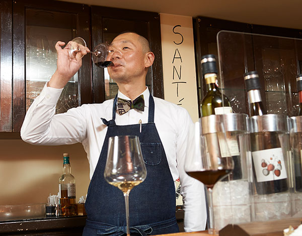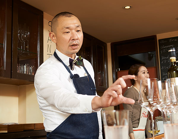 ランジュ・ヴァンは、カウンターとテーブル席二つ。常連様をはじめ、だいたいのお客様はカウンター席をご利用になりますが、ここではグラスワインもガブリエルグラスでご提供しています。気軽にガブリエルグラスに触れていただくためです。すると、それぞれのワインが「とても大切な1杯」に変わります。お客様の喜びの表情がそれを証明しています。